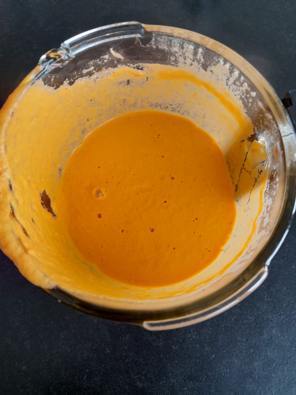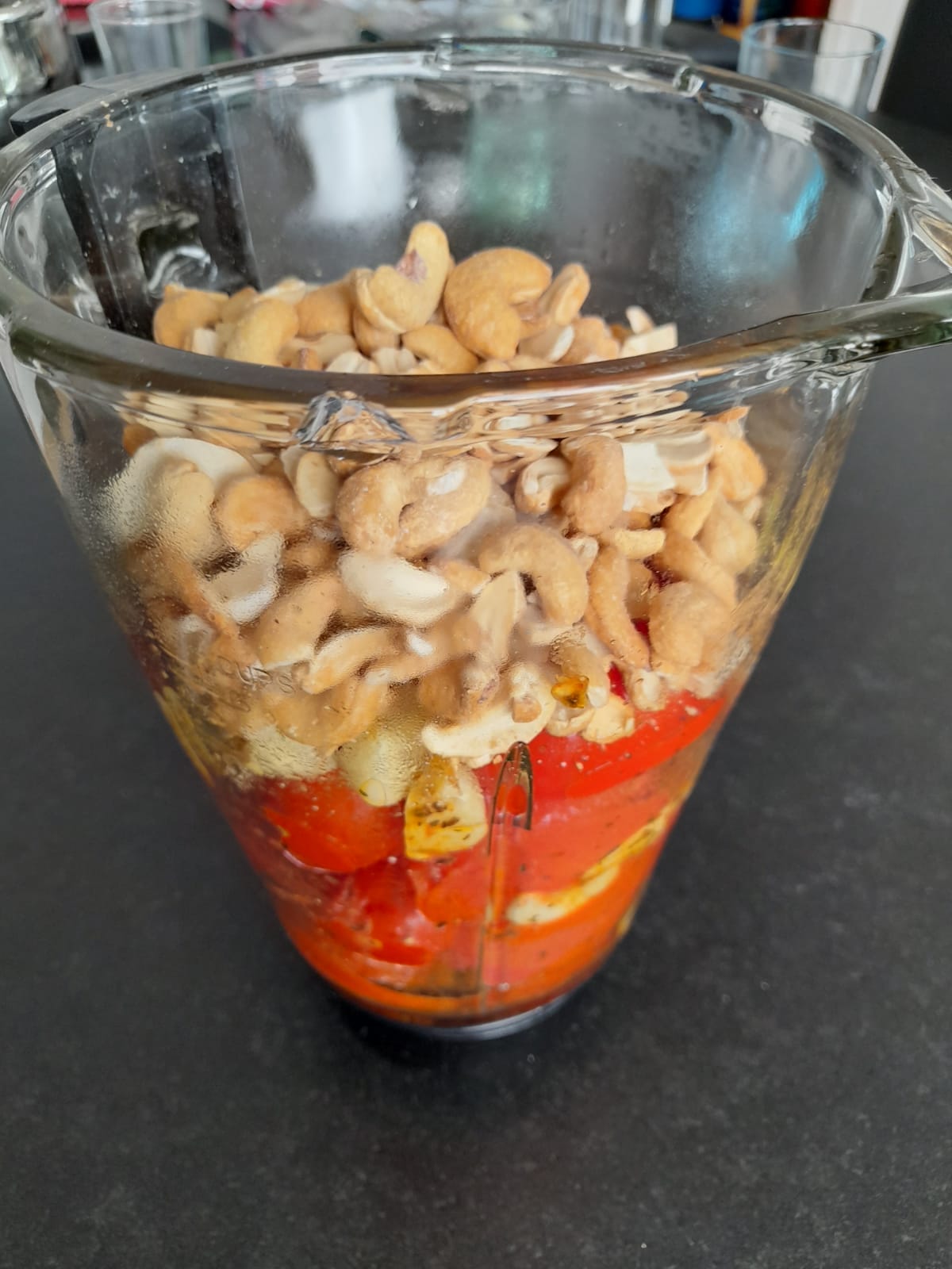 6. Den Inhalt der Ofenform in einen Standmixer geben, ca. 100 Gramm Cashewkerne und etwas Nudelwasser hinzugeben und mixen, bis eine dickflüssige Sauce entsteht.