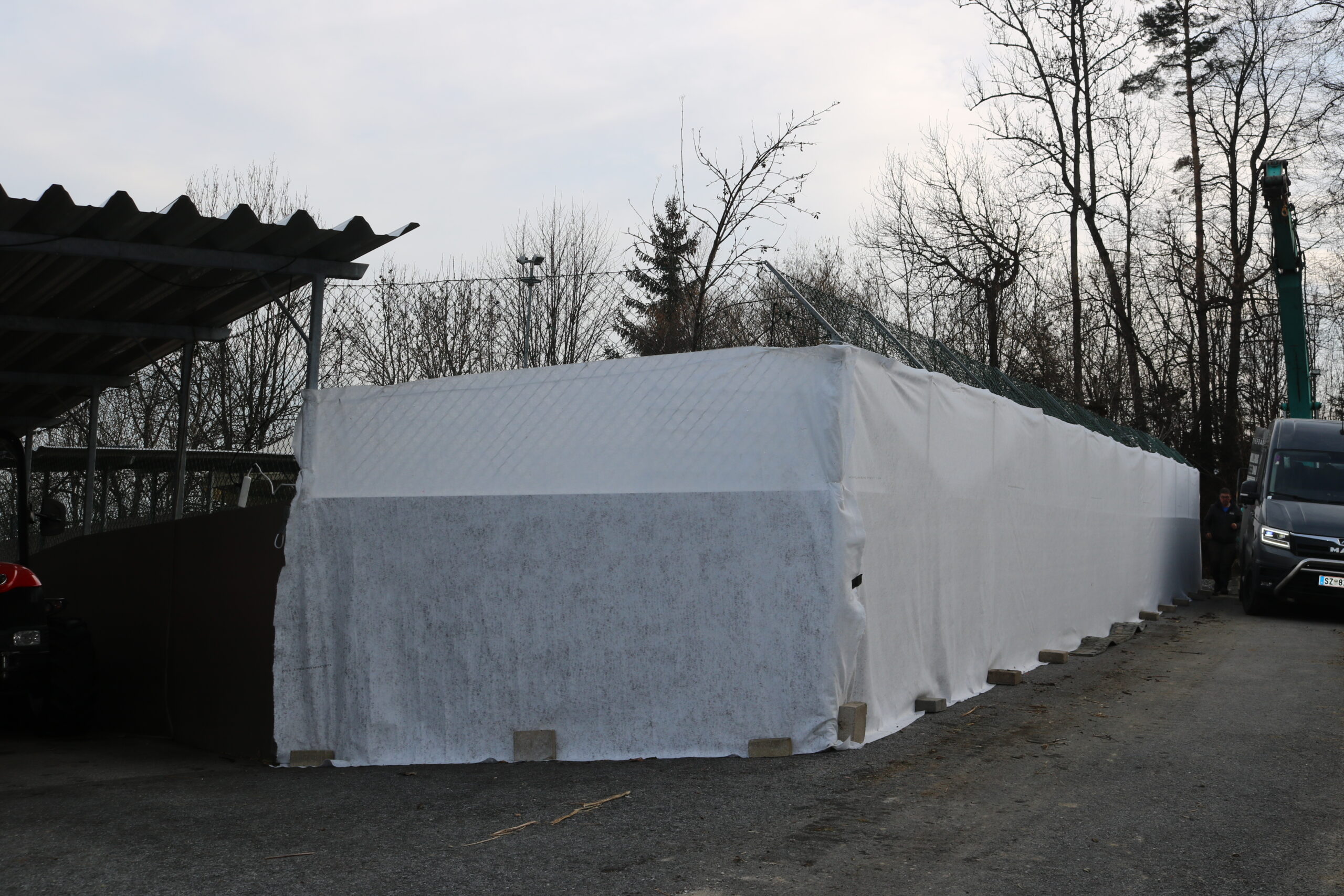 Überraschend schnell waren die Pfähle dann im Boden versenkt und mit Beton aufgefüllt. Damit war – was den Lärm betrifft – schon ein wichtiger Schritt geschafft. In den nächsten Wochen wird es dann etwas ruhiger zugehen, sodass der Sichtschutz vor den Hundegehegen ausreichen wird.