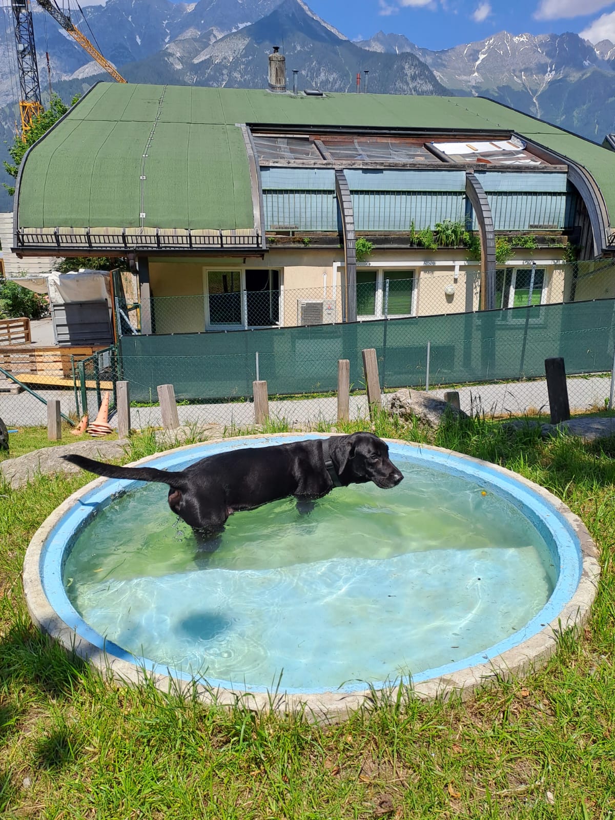In den vergangenen Tagen wurde am Dach gearbeitet, in den nächsten Wochen wird der Bau dann isoliert und anschließend mit der Inneneinrichtung begonnen. Nero ist schon gespannt, wie die Zimmer seiner Hundefreunde schlussendlich ausschauen werden. Nach der Baustellenbesichtigung gönnte er sich aber erst einmal eine kurze Abkühlung im Hundepool…