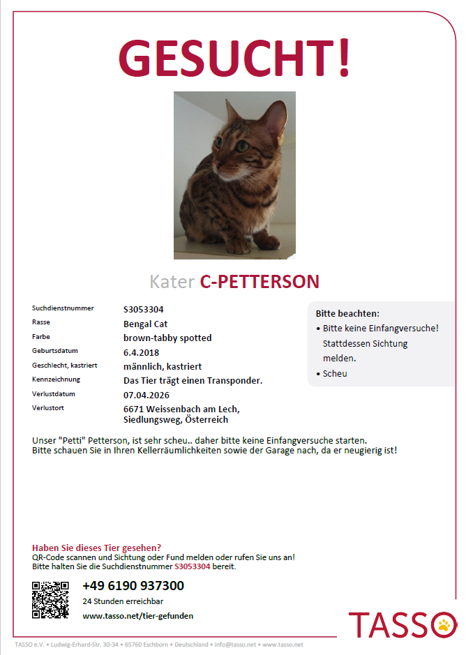 Hinweise an: Tasso, Tel. +49 6190 937300 unter Angabe der Suchdienstnummer S3053304 melden