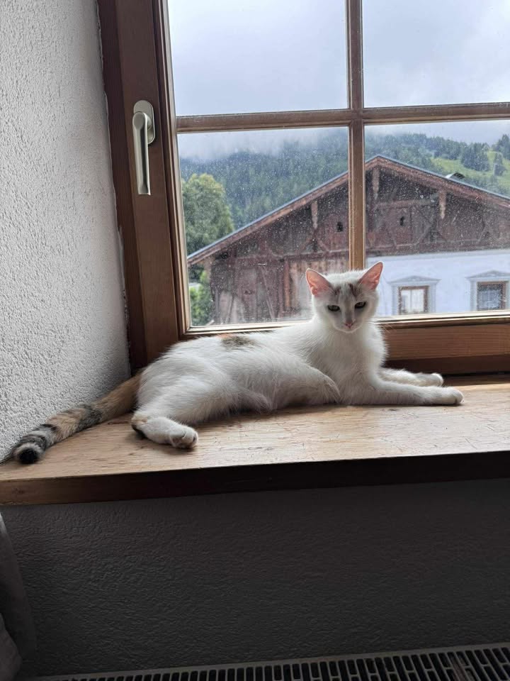 Beschreibung: Die dreifärbige Katze Ellie ist Freigängerin, nicht kastriert, nicht gechippt