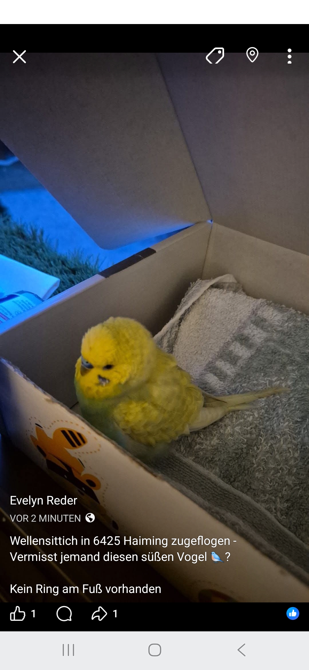 Beschreibung: Dieser Wellensittich ist den Findern am Sonntag zugeflogen. Er befindet sich nicht im Tierheim.