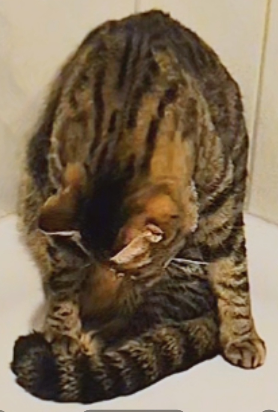 Bis auf ein kleinen weißen Fleck an der Brust komplett getigertes Fellmuster, schwarze Schwanzspitze